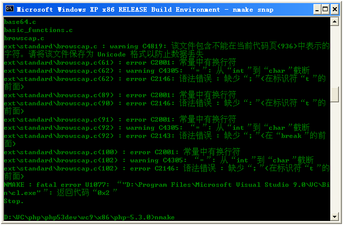 nmake - 这一步在php wiki上是没有问题,但由于我们是中文环境,会报下面的错误: